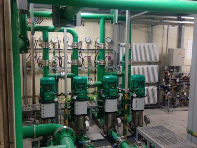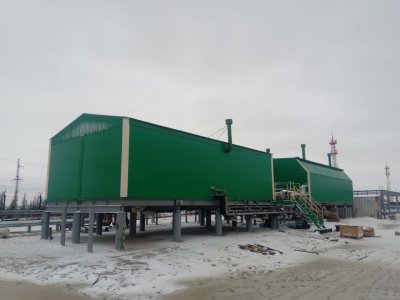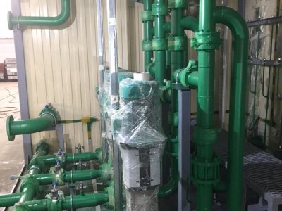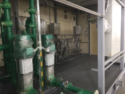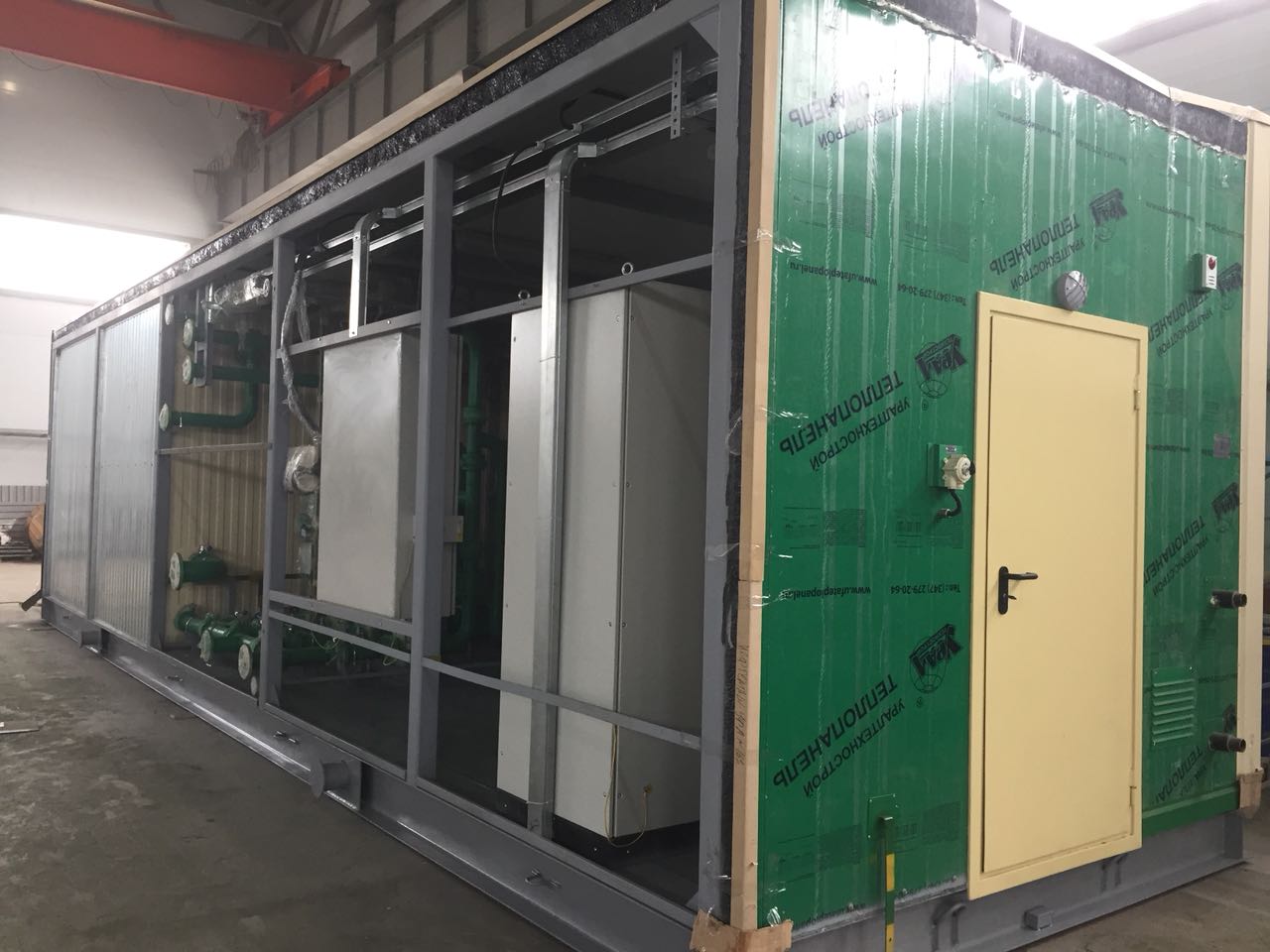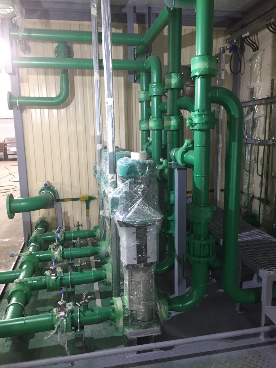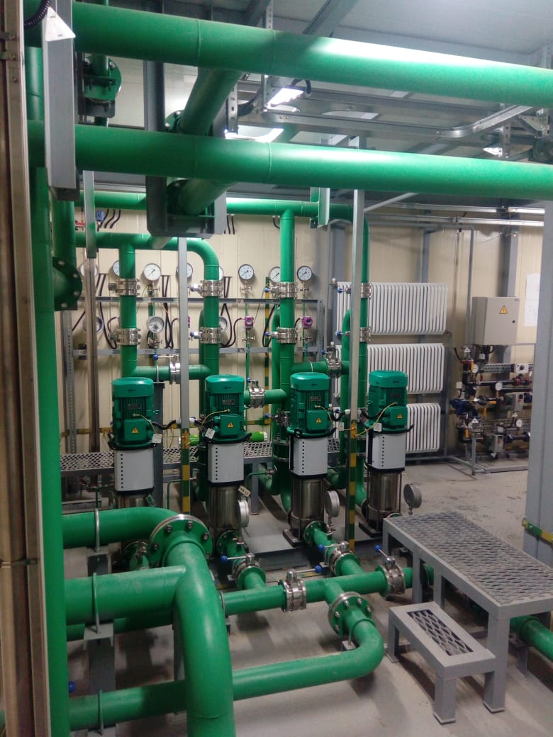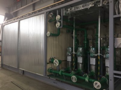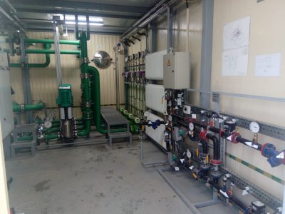 The pumping station is a block-box with overall dimensions of 6340x12000x4150 mm, consists of three tanks of clean water with a total volume of 100 m³, four pumping units (2 workers, 2 backup) with a capacity of 50 m³ / h each, pipelines with shut-off and control valves, instrumentation devices that provide control and automation functions, service platforms, a thermal energy metering unit.